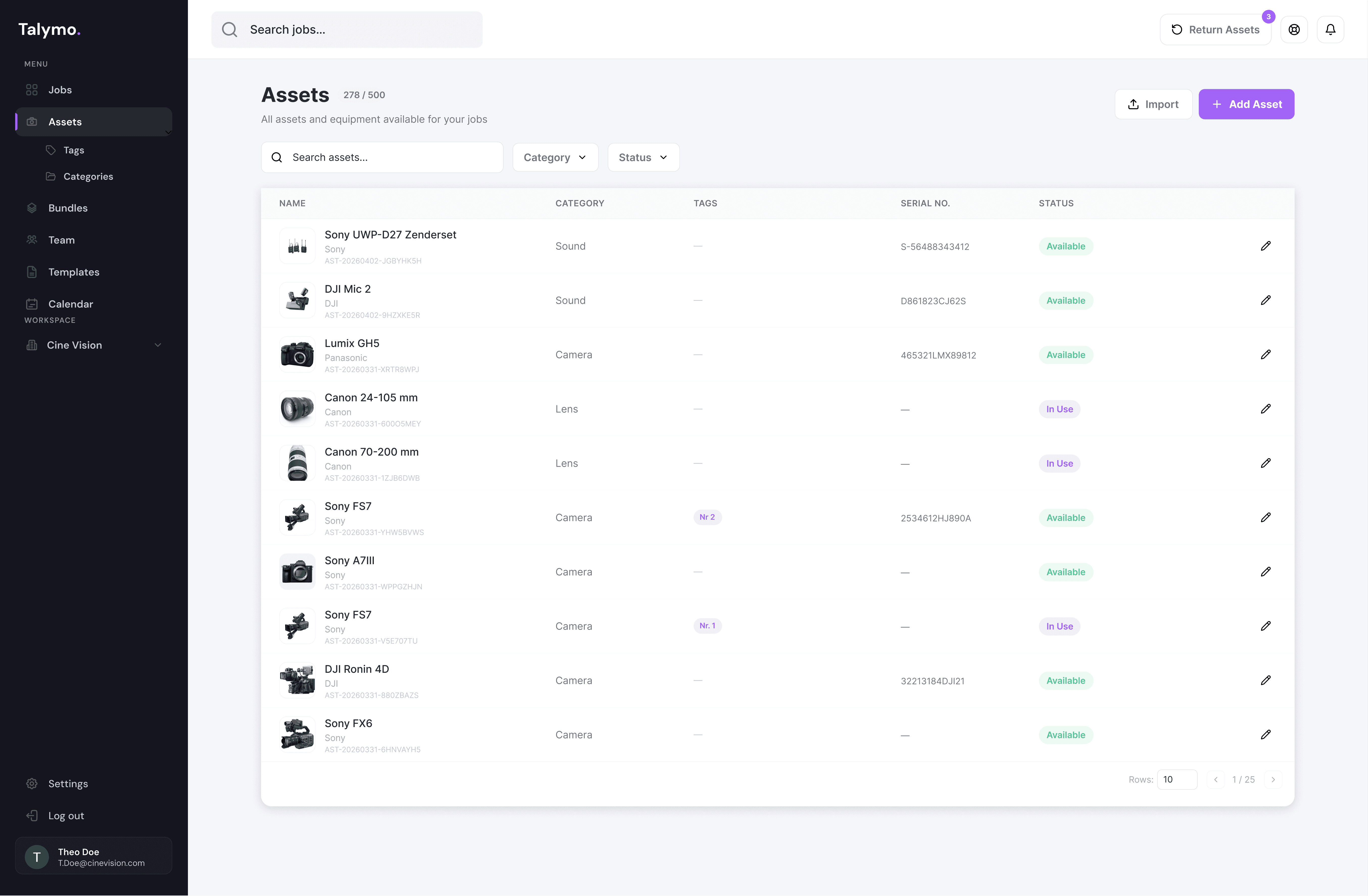The moment you assign gear to a job, Talymo locks it. If it's already booked on overlapping dates, you'll know instantly before it becomes a problem on shoot day.